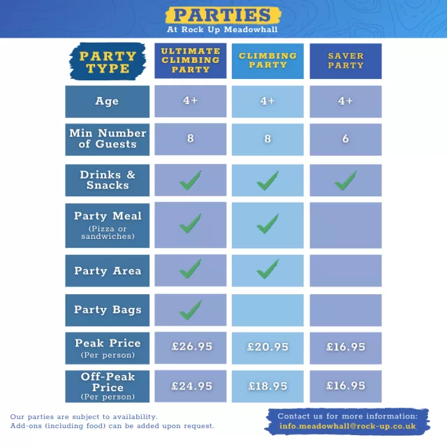 Soft Play sessions are stay and play. Meaning you can pay once and play all day! At the weekends and during school holidays our soft play sessions typically last for 2 hours. Parties at Rock Up last 90 minutes in total. The first 20 minutes is for guests to arrive and receive their safety briefing. The following 40 minutes is spent on their activity and the remaining time is spent in the party area where they can enjoy a mountain of refreshments.