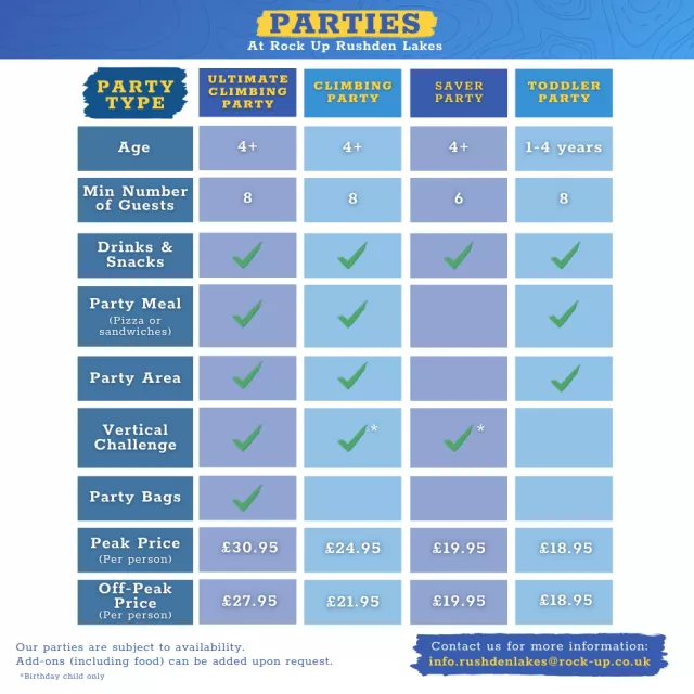 Soft Play sessions are stay and play sessions during the week in term time. Meaning you can pay once and play all day! At the weekends and during school holidays our soft play sessions typically last for 2 hours. Parties at Rock Up last 2 hours in total. The first 30 minutes is for guests to arrive and receive their safety briefing. The following hour is spent on their activity and the final 30 minutes is spent in the party area where they can enjoy a mountain of refreshments. Subject to availability.